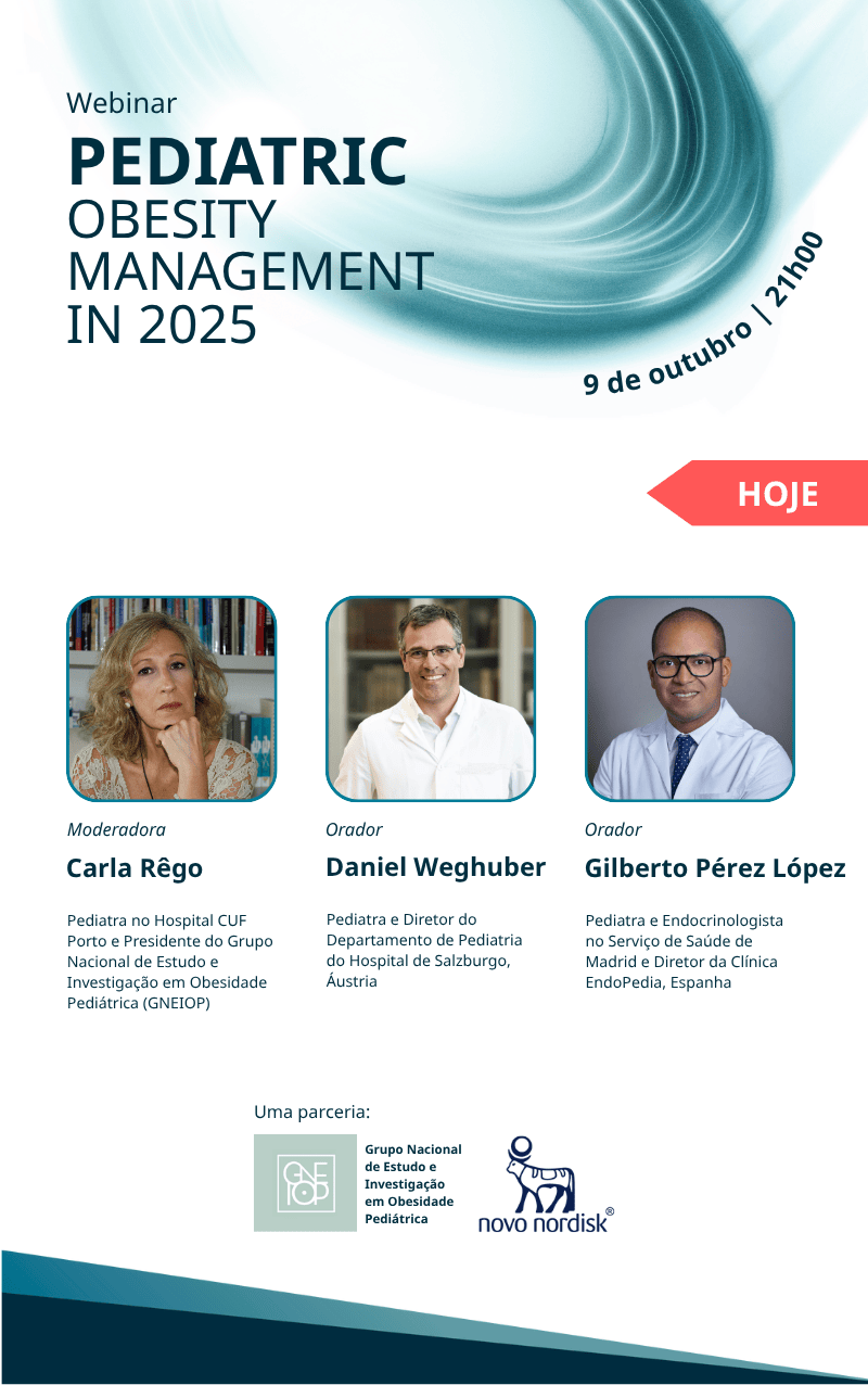 Hoje pelas 21h00, não perca o webinar “Pediatric Obesity Management in 2025”, uma iniciativa da Novo Nordisk e do Grupo Nacional de Estudo e Investigação em Obesidade Pediátrica (GNEIOP). À luz das mais recentes recomendações internacionais, os pediatras Carla Rêgo, Daniel Weghuber e Gilberto Pérez López irão conversar sobre a importância de uma gestão adequada e atempada da obesidade na criança e no adolescente.